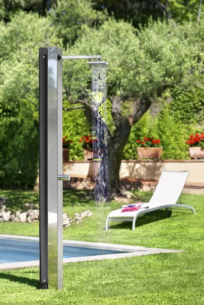 • Ducha en acero inoxidable pulido AISI-304 que aprovecha la energía solar para calentar el agua gracias a su depósito acumulador de agua perfectamente integrado.