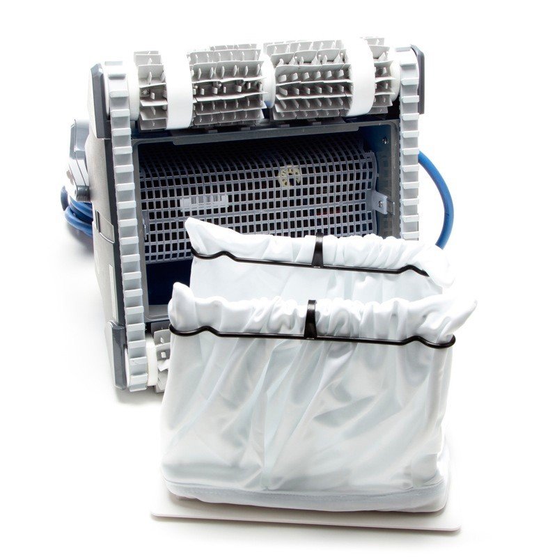 - Dos bolsas de filtración fina y ultra fina porosidad que permiten optimizar la limpieza según el estado de la piscina.