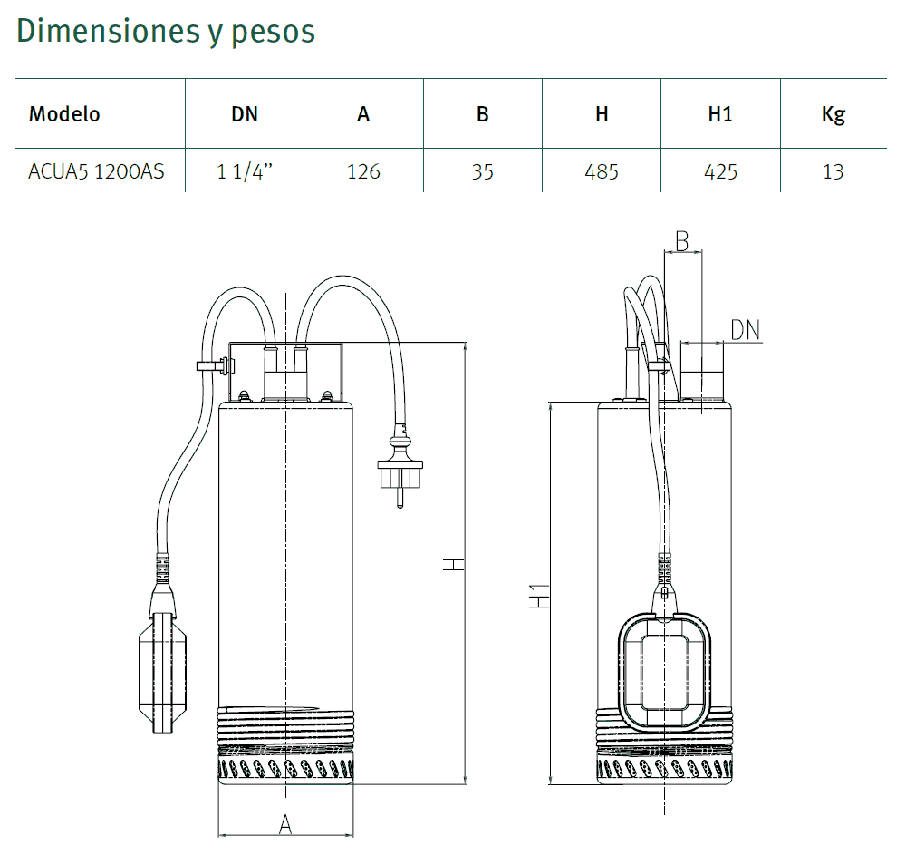 La bomba sumergible para riego ACUA5 1200AS se suministra con 10 m de cable eléctrico H05RN-F ,enchufe, interruptor de nivel y entronque de salida en material plástico para varios diámetros de manguera.