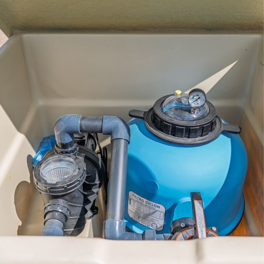 • Filtracion completa que consta de filtro y bomba montados con sus valvulas y accesorios necesarios instalados.