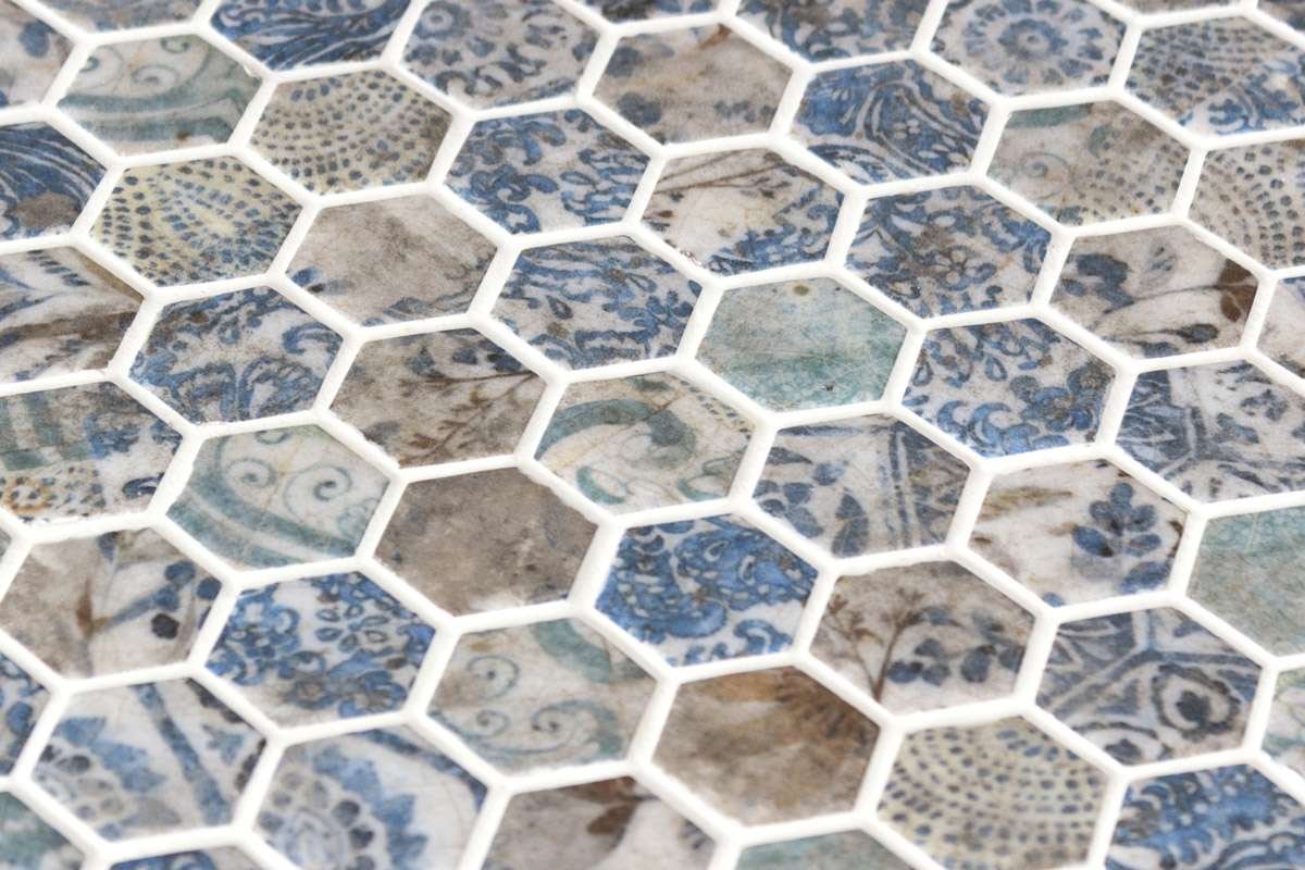 El mosaico vítreo Hex Azulao Original es un mosaico multicolor de teselas hexagonales Hex (diámetro ø 31,75 mm – 1, 25”). Su gráfica, de inspiración artesanal, recoge los diseños del clásico azulejo hidráulico con un acabado esmaltado rústico.