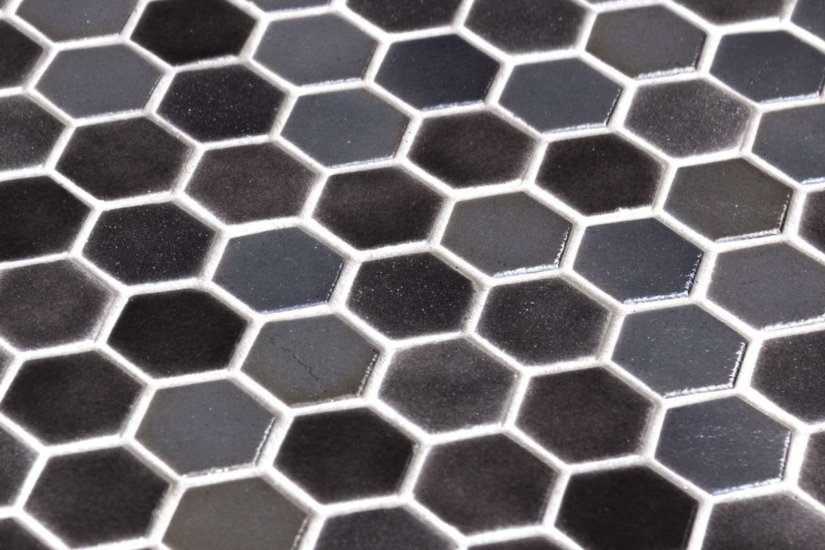 El mosaico vítreo Hex Blend Black es un mosaico de teselas hexagonales Hex (diámetro ø 31,75 mm – 1, 25”) de color negro y gris oscuro que combina texturas brillo y stoneglass. Una base de color en tonos cálidos apta para cualquier revestimiento.