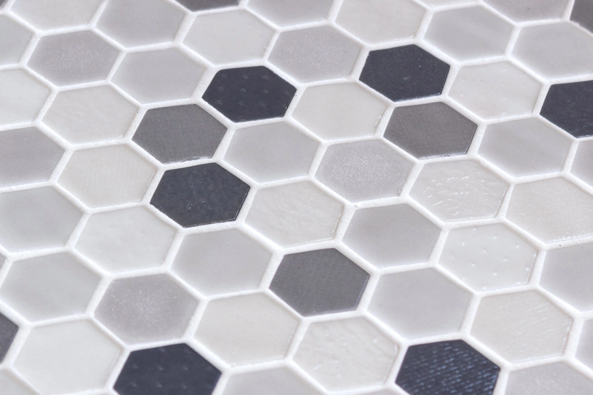 El mosaico vítreo Hex Blend Shadow es un mosaico de teselas hexagonales Hex (diámetro ø 31,75 mm – 1, 25”) de color gris y negro que combina texturas brillo y stoneglass. Un producto sofisticado para alta decoración con un sutil contraste.