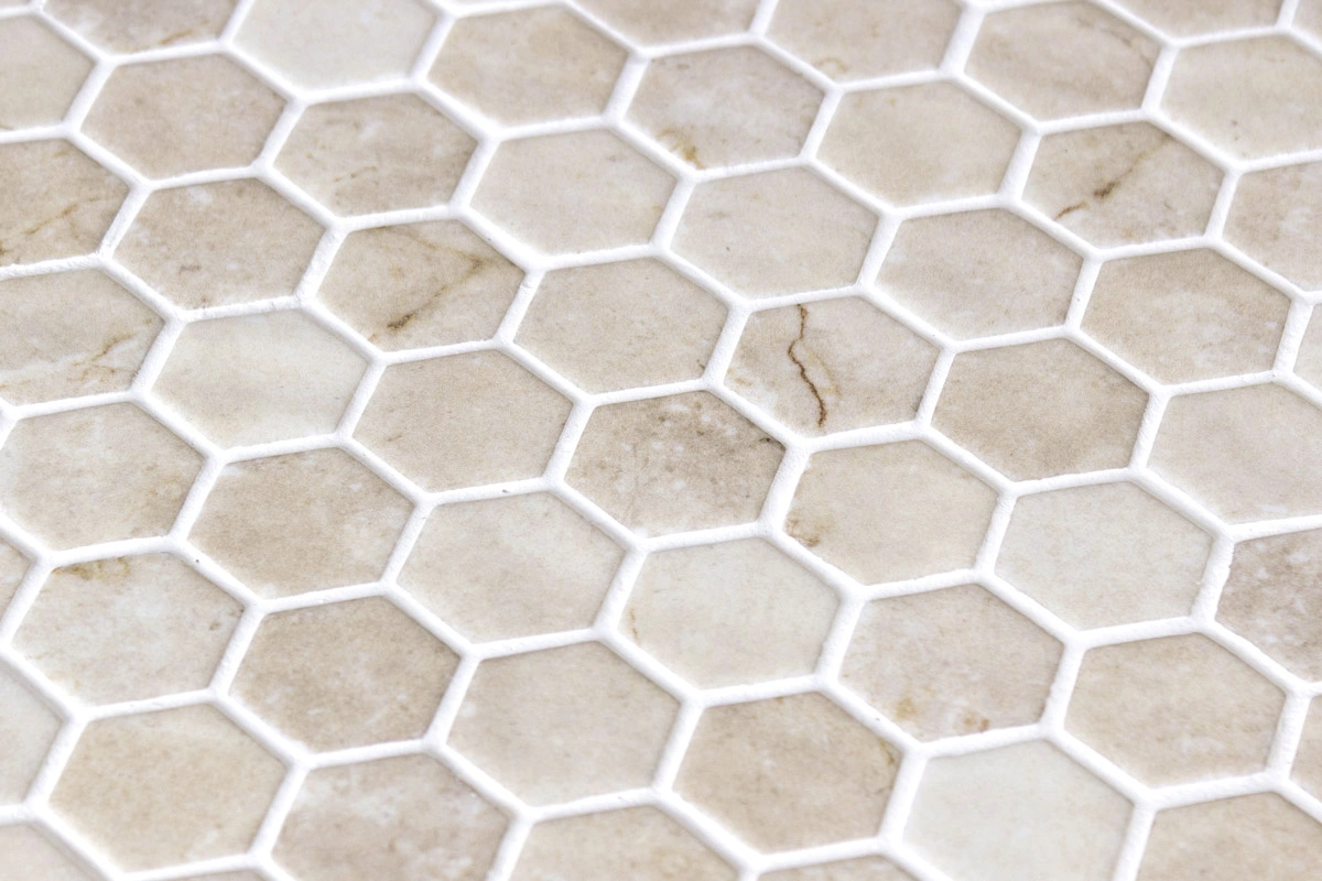 El mosaico vítreo Hex Crema Marfil Matte es un mosaico de teselas hexagonales Hex (diámetro ø 31,75 mm – 1, 25”) de color crema en mármol con sutiles vetas marrones y acabado antideslizante mate SEDA. Ideal para paredes y suelos.