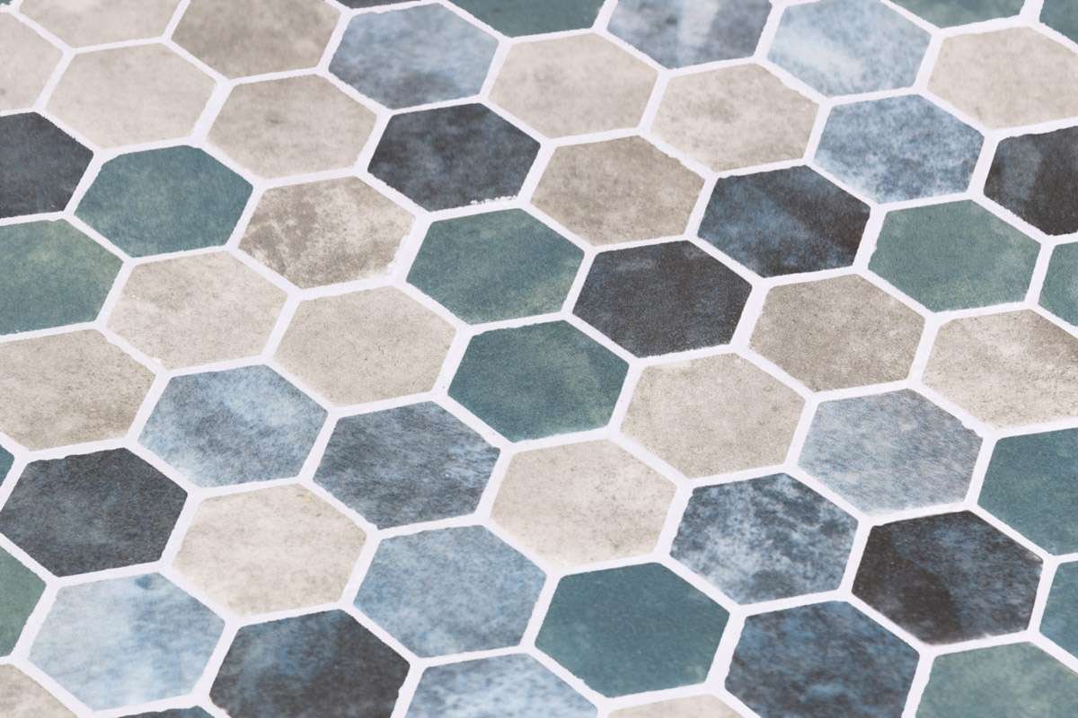 El mosaico vítreo Hex Frisia Silver Matte es un mosaico de teselas hexagonales Hex (diámetro ø 31,75 mm – 1, 25”) con una mezcla de tonos turquesa, azul y gris de aspecto piedra en acabado mate satinado. Especificado en revestimientos.
