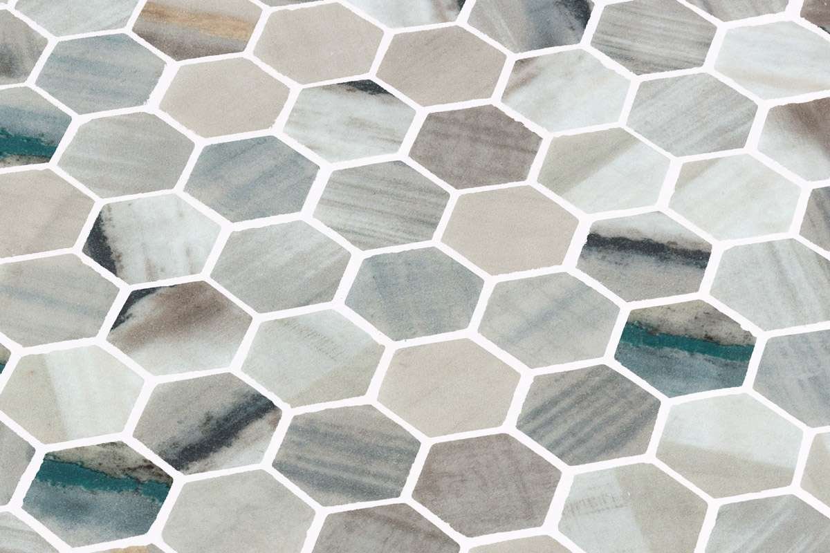 El mosaico vítreo Hex Lube es un mosaico de teselas hexagonales Hex (diámetro ø 31,75 mm – 1, 25”) con efecto pinceladas en tonos beige, gris y detalles en azul, en acabado mate y brillo. Diseño de inspiración industrial para la decoración de cualquier estancia.