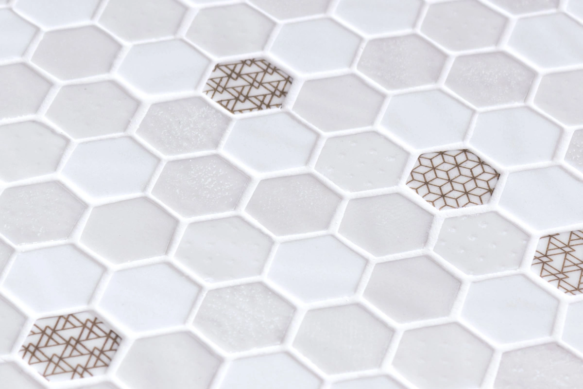El mosaico vítreo Hex Lynx es un mosaico de teselas hexagonales Hex (diámetro ø 31,75 mm – 1, 25”) de color blanco brillo con detalles de oro 24 quilates. Un mosaico diseñado para la más alta decoración de paredes, tanto de interior como exterior.