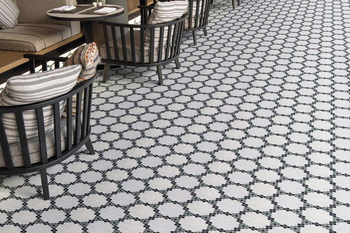 Hex Pattern 14 es un patrón de mosaico vítreo hexagonal, diseño retro, dibujo de flores entrelazadas en círculos, un clásico para suelos elegantes en restaurantes y zonas comerciales.