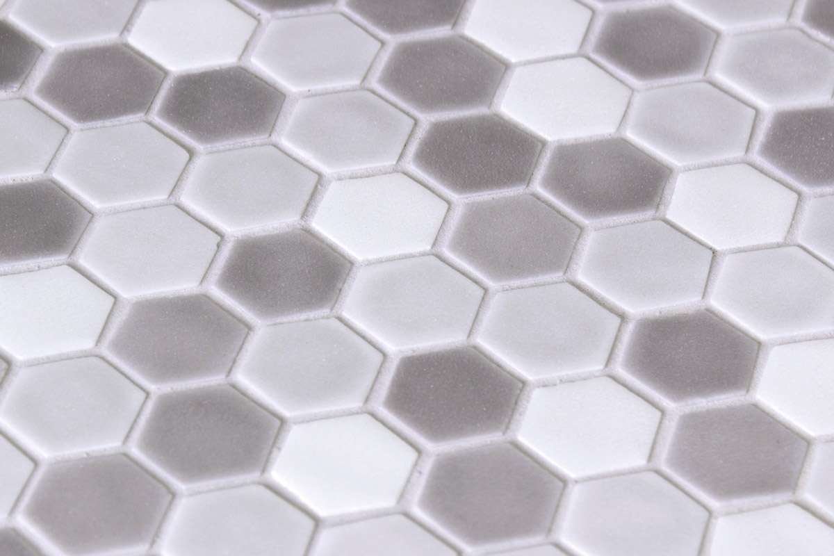 El mosaico vítreo Hex Stoneblend Anchor es un mosaico de teselas hexagonales Hex (diámetro ø 31,75 mm – 1, 25”) en tonos gris y blanco y acabado texturizado stoneglass antideslizante y resistente a la abrasión, especificado para zonas comerciales.