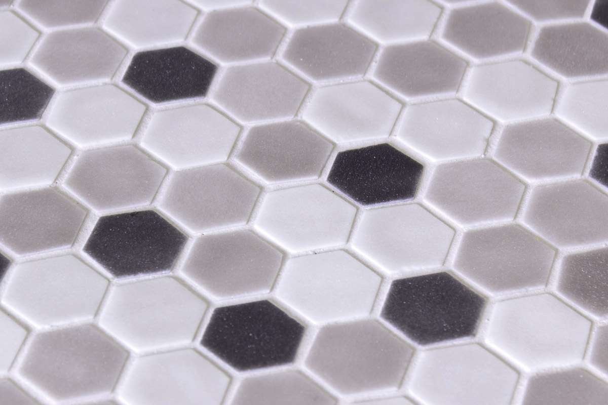 El mosaico vítreo Hex Stoneblend Smoke es un mosaico de teselas hexagonales Hex (diámetro ø 31,75 mm – 1, 25”) en tonos gris y negro y acabado texturizado stoneglass antideslizante y resistente a la abrasión, especificado para zonas comerciales.