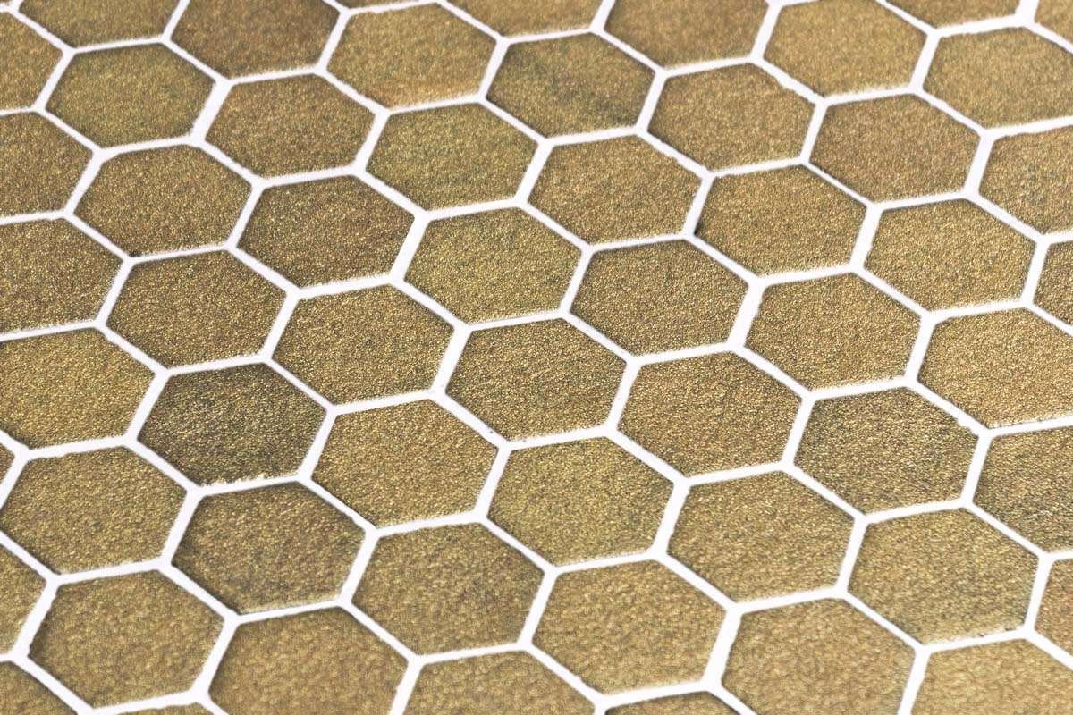 El mosaico vítreo Hex Stoneglass Gold es un mosaico de teselas hexagonales Hex (diámetro ø 31,75 mm – 1, 25”) de color dorado y acabado texturizado de alta resistencia. Especificado en particular para suelos de zonas comerciales.