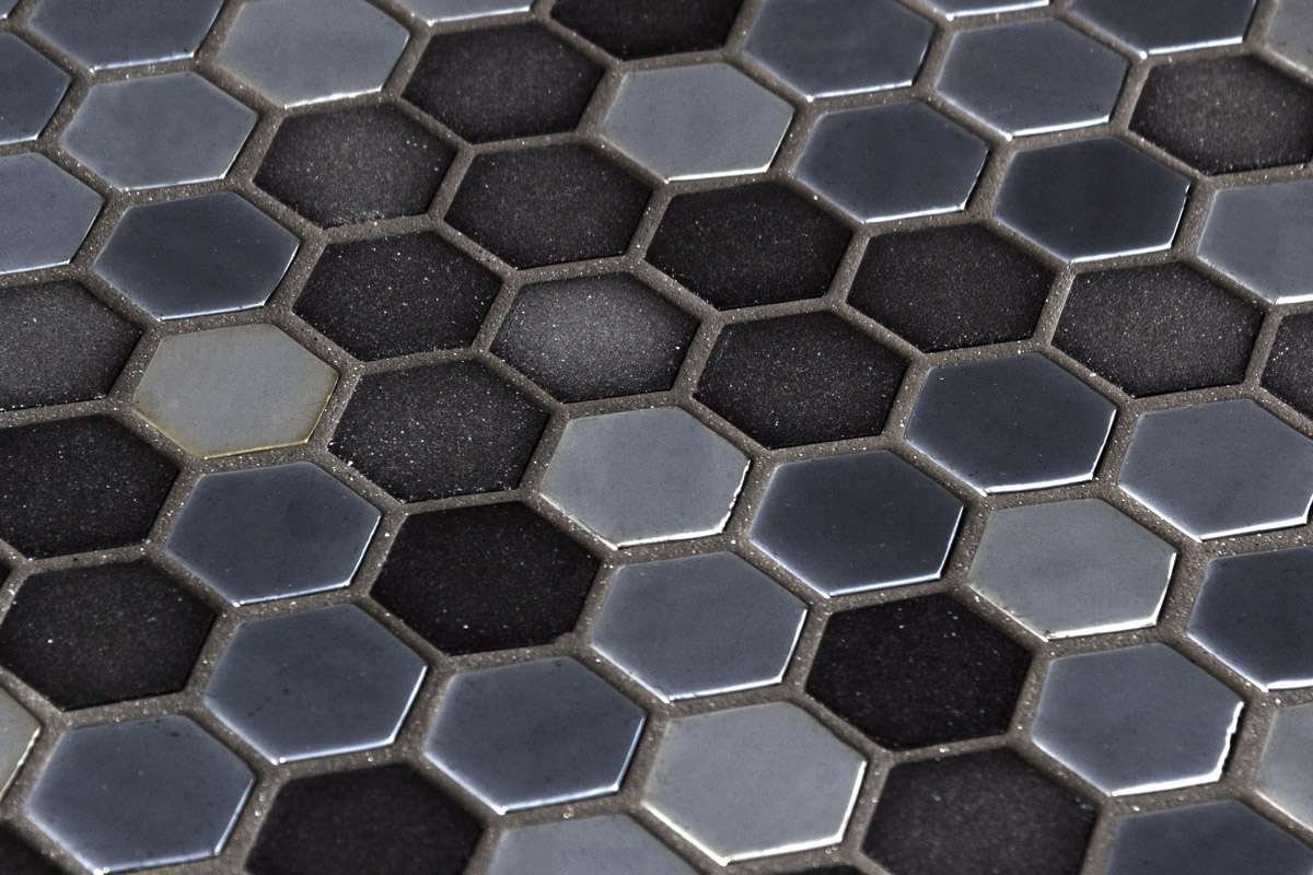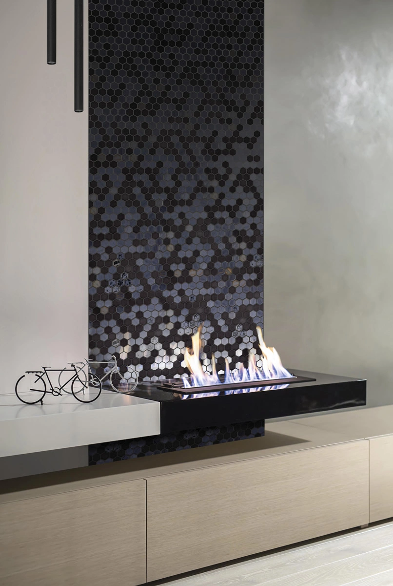 El mosaico vítreo Hex Stoneglass Opalo Black es un mosaico de teselas hexagonales Hex (diámetro ø 31,75 mm – 1, 25”) de color negro que combina texturas brillo y stoneglass. Una base monocolor indicada para revestimientos decorativos de cualquier estancia.