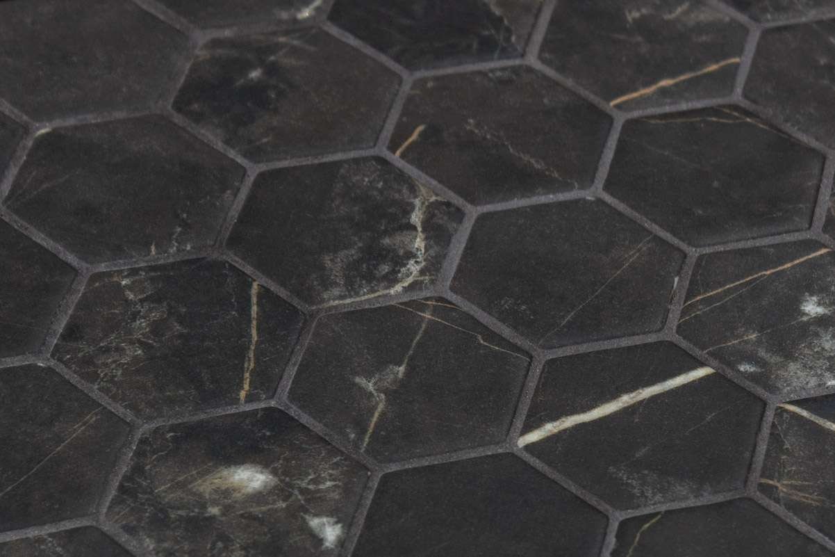 El mosaico vítreo Hex XL Coimbra Matte es un mosaico de teselas hexagonales Hex XL (diámetro ø 51,6 mm – 2”)de color negro mármol con vetas en beige y acabado mate antideslizante. Apto tanto para revestimiento y suelos.