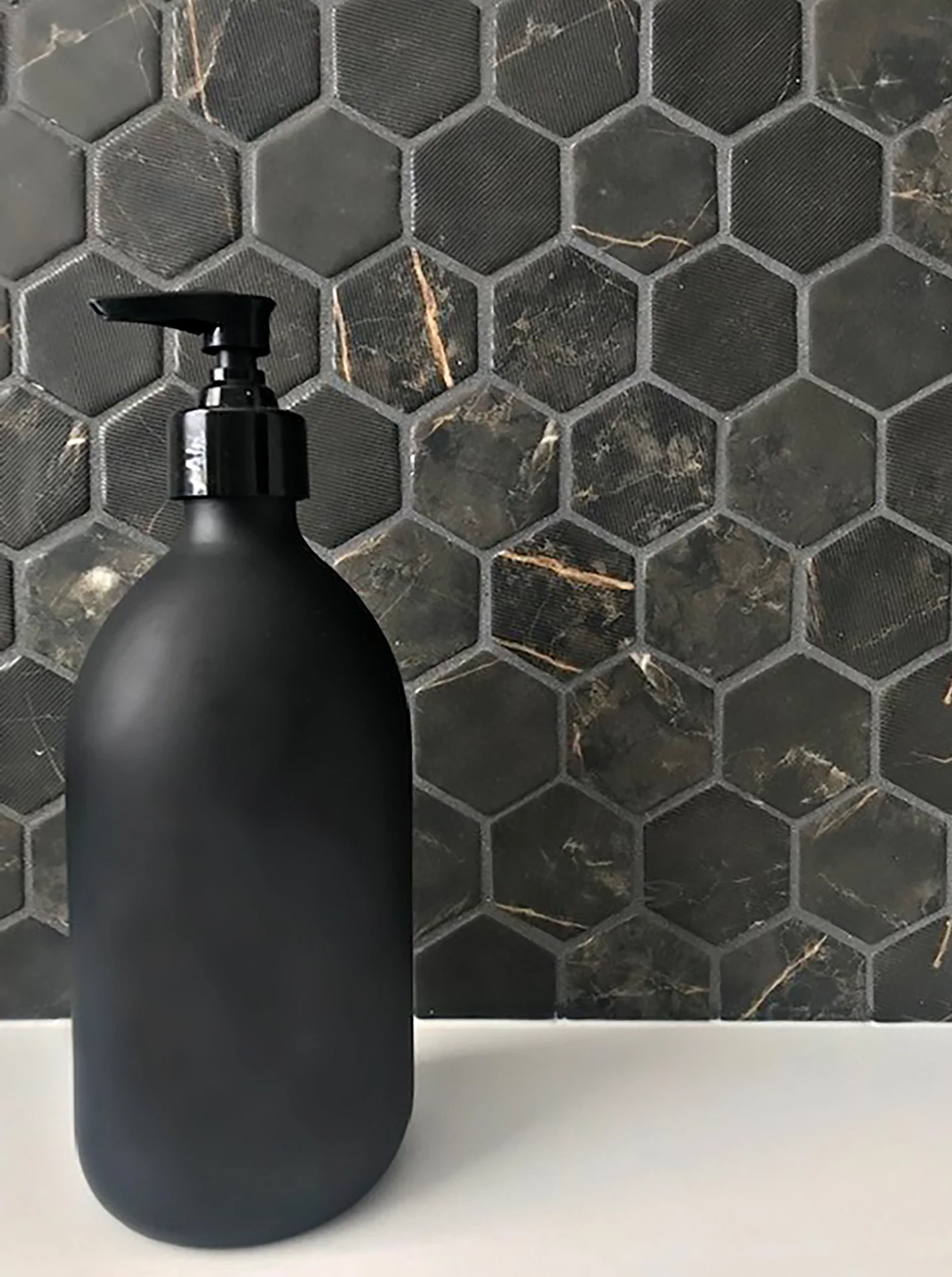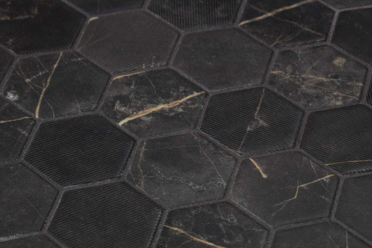 El mosaico vítreo Hex XL Coimbra Textured es un mosaico de teselas hexagonales Hex XL (diámetro ø 51,6 mm – 2”) de color negro mármol con vetas en beige y acabado mate combinado con textura de lineas. Polivalente para suelo y pared.