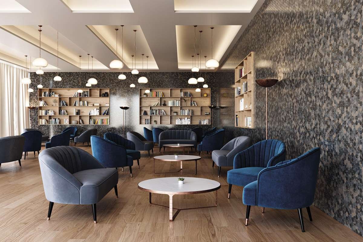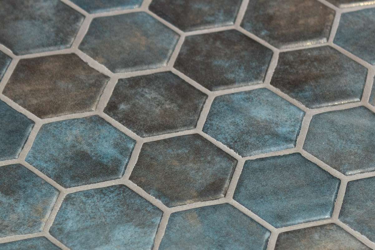 El mosaico vítreo Hex XL Denim Copper es un mosaico de teselas hexagonales Hex XL (diámetro ø 51,6 mm – 2”) de color azulado efecto desgastado con detalles en cobre y acabado satinado. Muy recomendado para paredes decorativas en salones o restaurantes.
