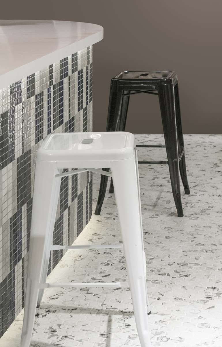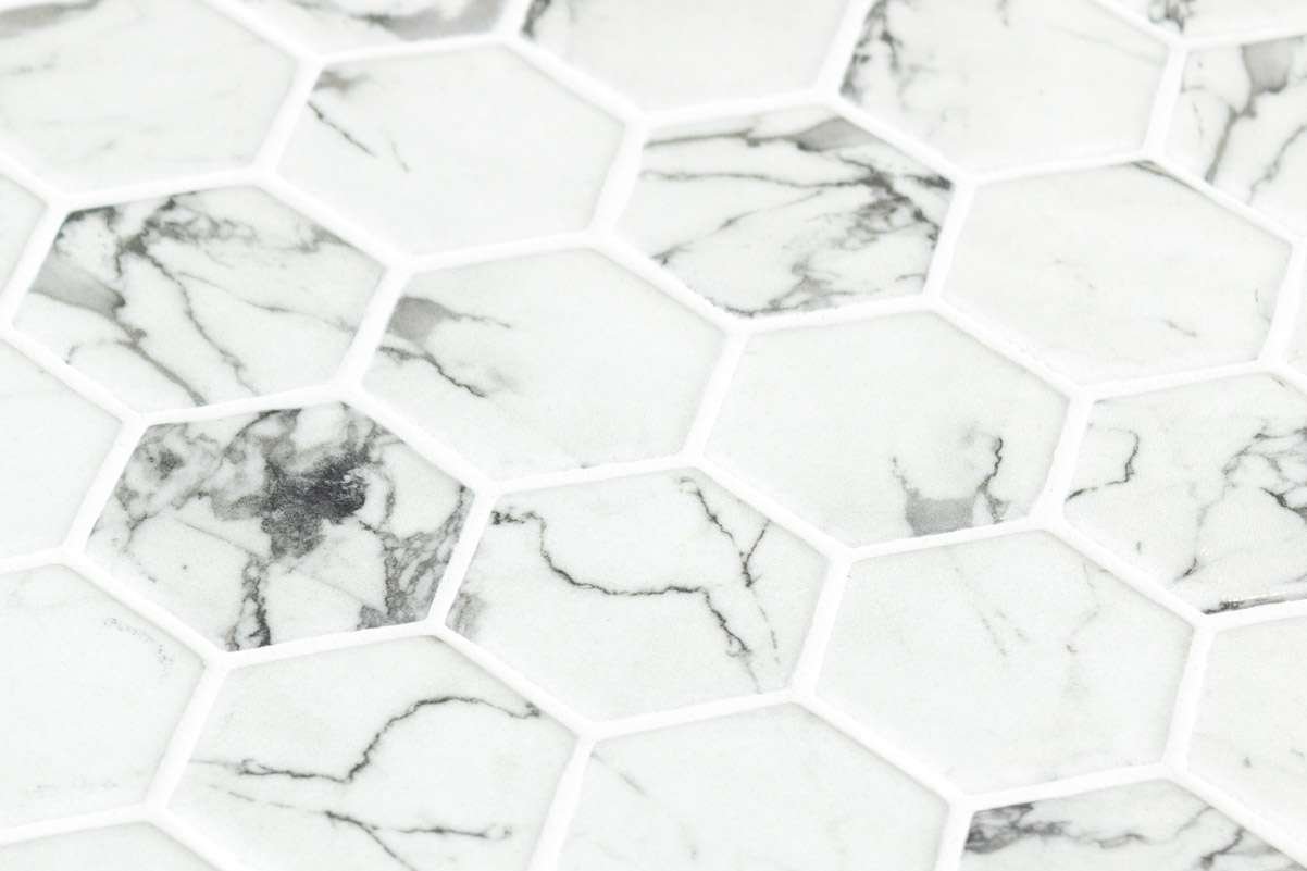 El mosaico vítreo Hex XL Fosco Matte es un mosaico de teselas hexagonales Hex XL (diámetro ø 51,6 mm – 2”) de color blanco mármol con vetas marcadas en gris brillante y con acabado antideslizante. Un mosaico que nunca falla.
