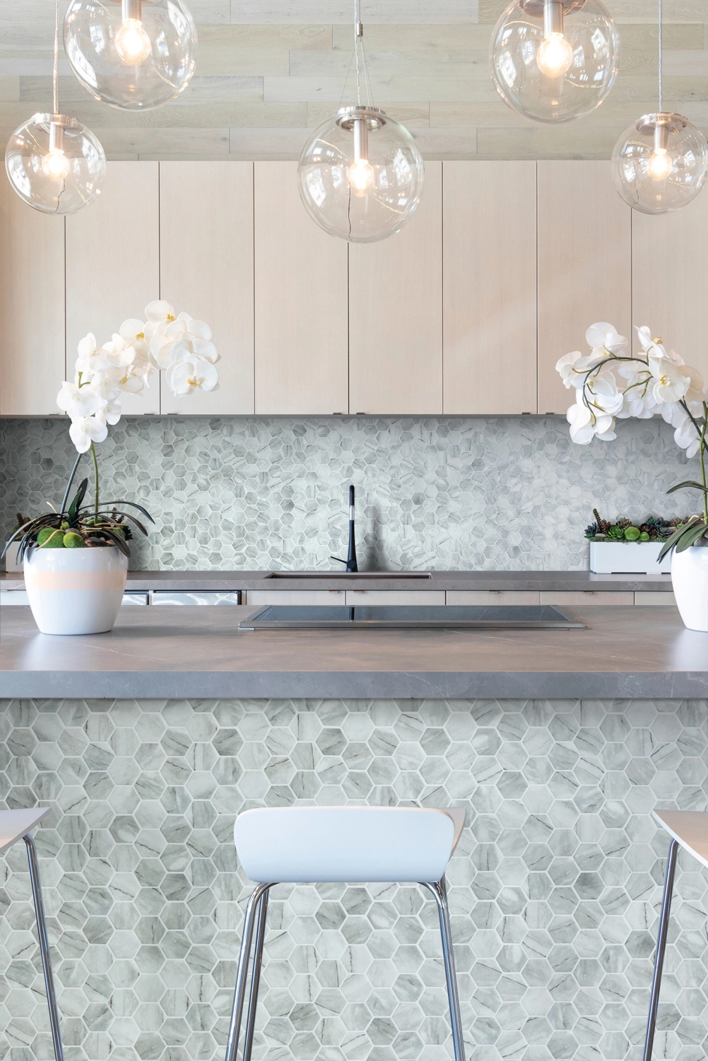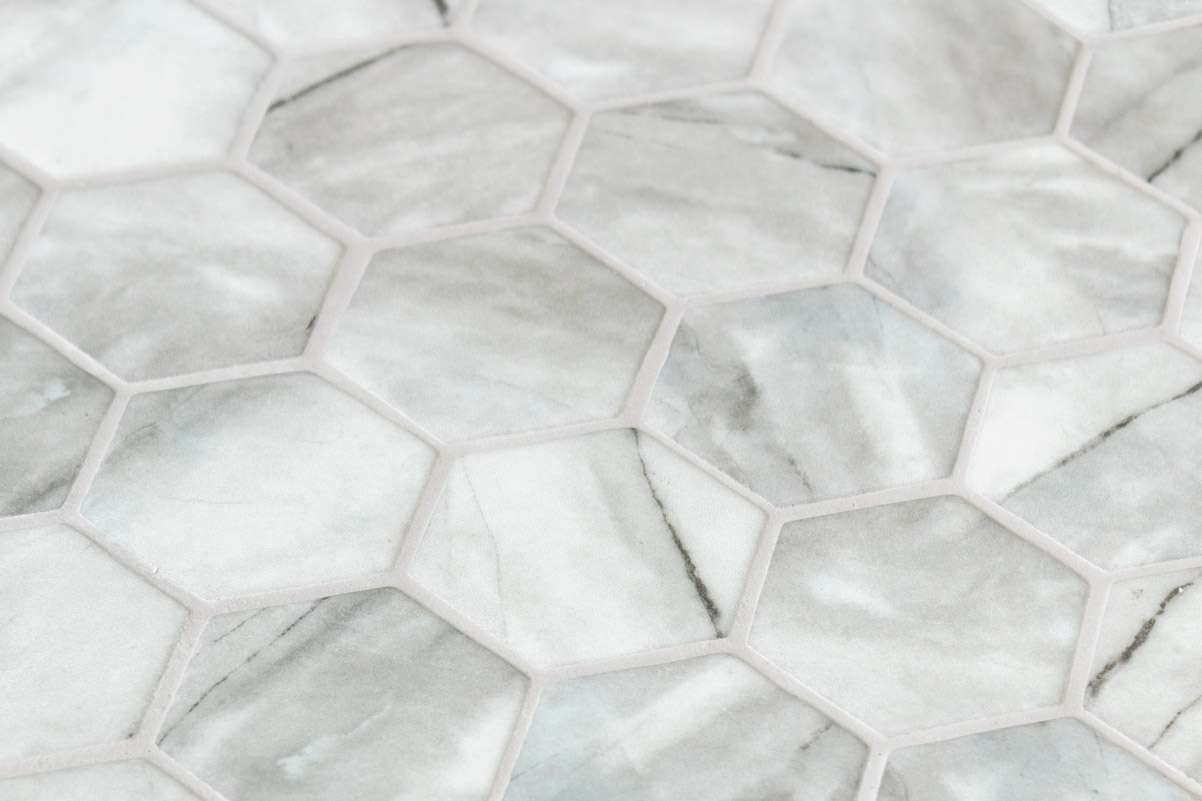 El mosaico vítreo Hex XL Inverno Grey Matte es un mosaico de teselas hexagonales Hex XL (diámetro ø 51,6 mm – 2”) de color gris claro y acabado piedra antideslizante, con detalles de vetas oscuras que dotarán de personalidad a cualquier espacio.