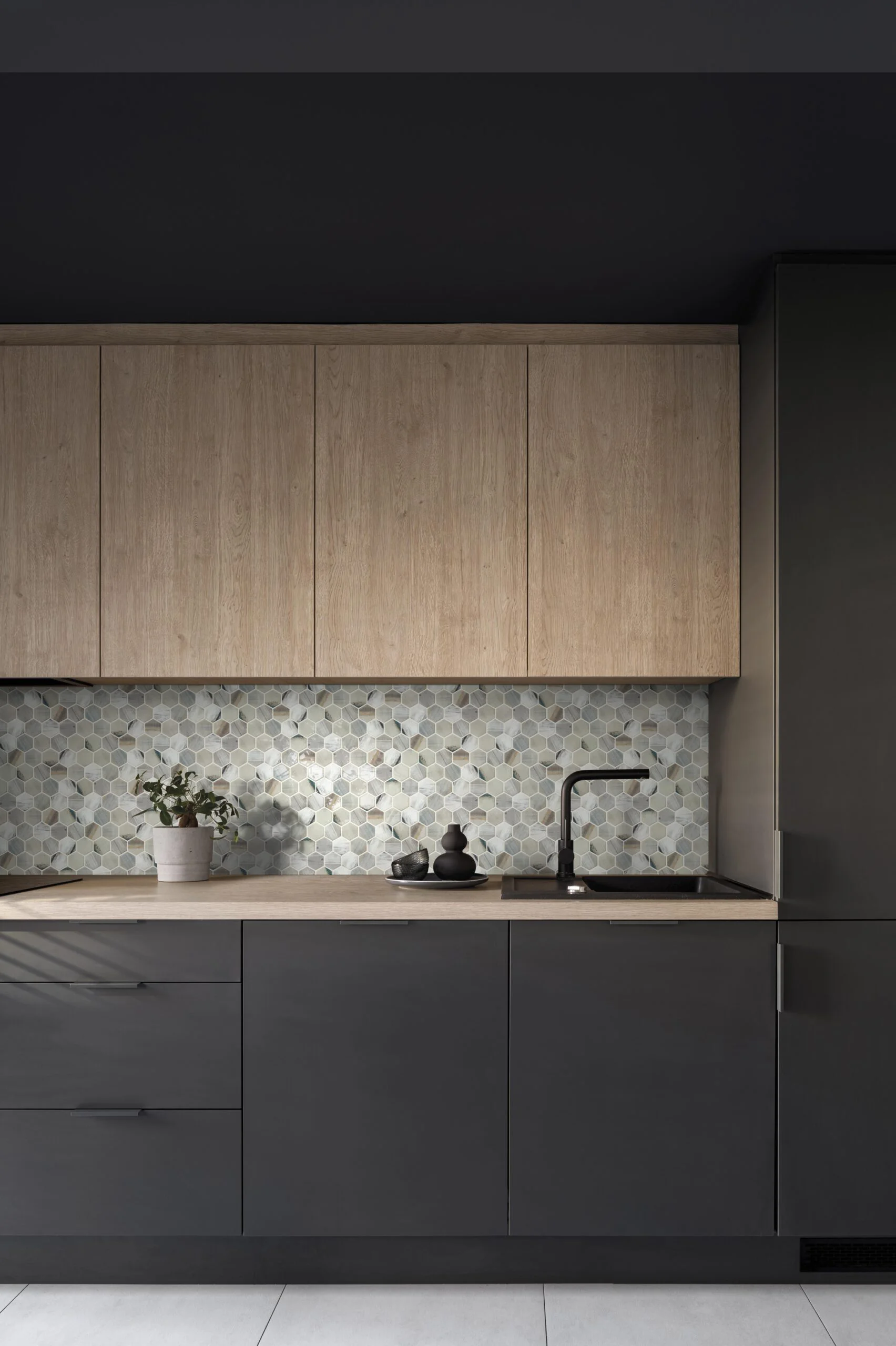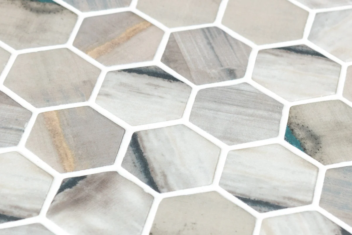 El mosaico vítreo Hex XL Lube es un mosaico de teselas hexagonales Hex XL (diámetro ø 51,6 mm – 2”) con efecto de pinceladas en tonos beige, gris y detalles en azul, en acabado mate y brillo. Un mosaico de diseño de inspiración industrial para la decoración de cualquier estancia.