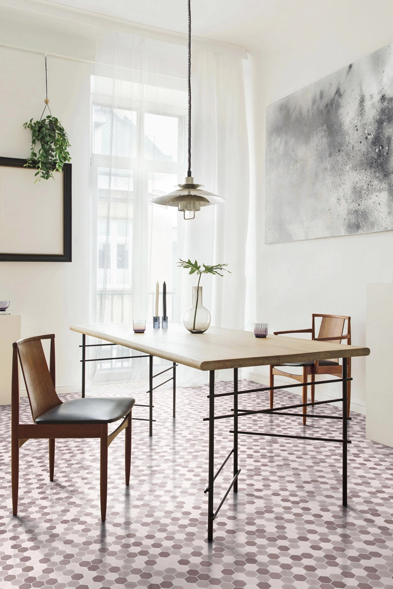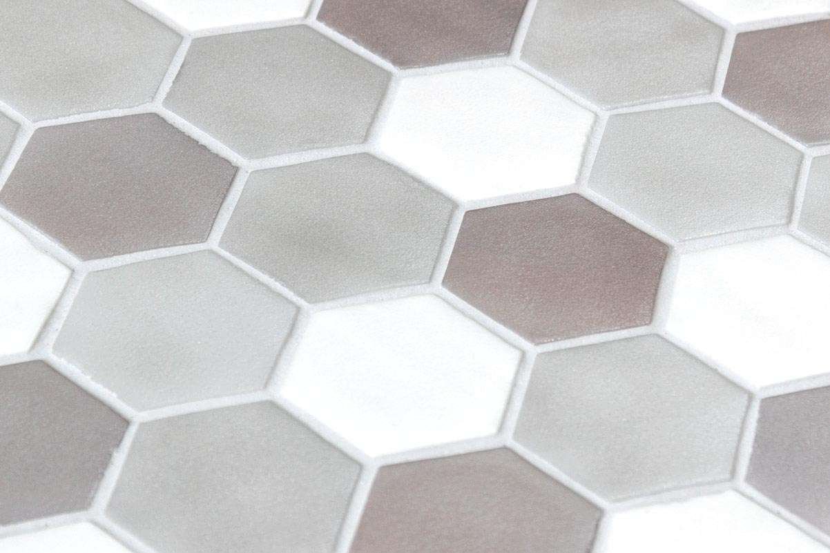 El mosaico vítreo Hex XL Stoneblend Loft es un mosaico de teselas hexagonales Hex XL (diámetro ø 51,6 mm – 2”) de tonos gris y moka y acabado stoneglass antideslizante de alta resistencia al desgaste. Un producto ideal para suelos comerciales.
