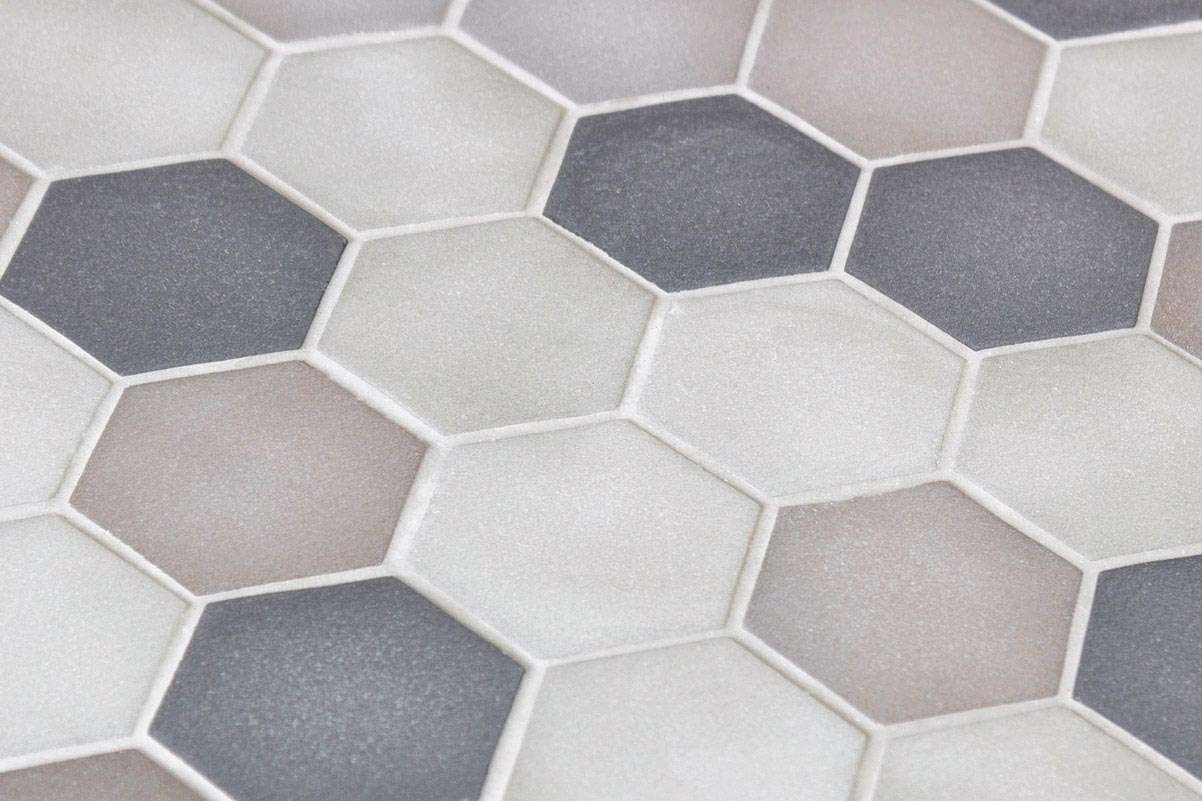 El mosaico vítreo Hex XL Mixed Grey es un mosaico de teselas hexagonales Hex XL (diámetro ø 51,6 mm – 2”) de tonos gris oscuro y moka y acabado stoneglass antideslizante de alta resistencia al desgaste. Un producto ideal para suelos comerciales.