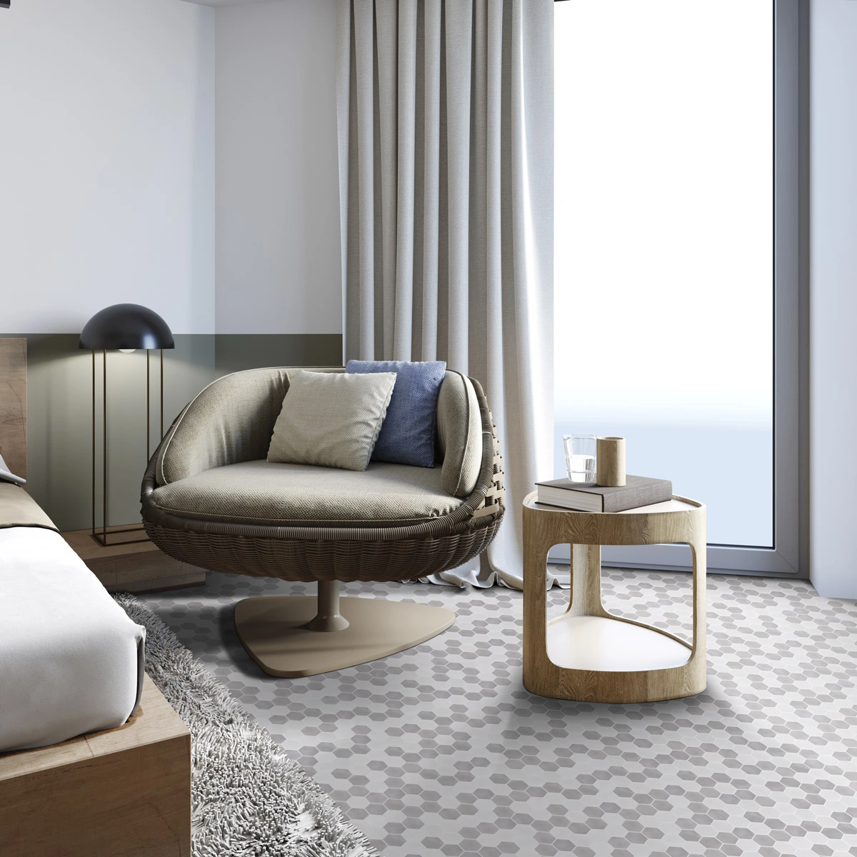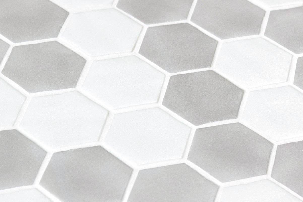 El mosaico vítreo Hex XL Stoneblend Soft es un mosaico de teselas hexagonales Hex XL (diámetro ø 51,6 mm – 2”) de tonos claros en gris y blanco y acabado stoneglass antideslizante de alta resistencia al desgaste. Un producto ideal para suelos comerciales.