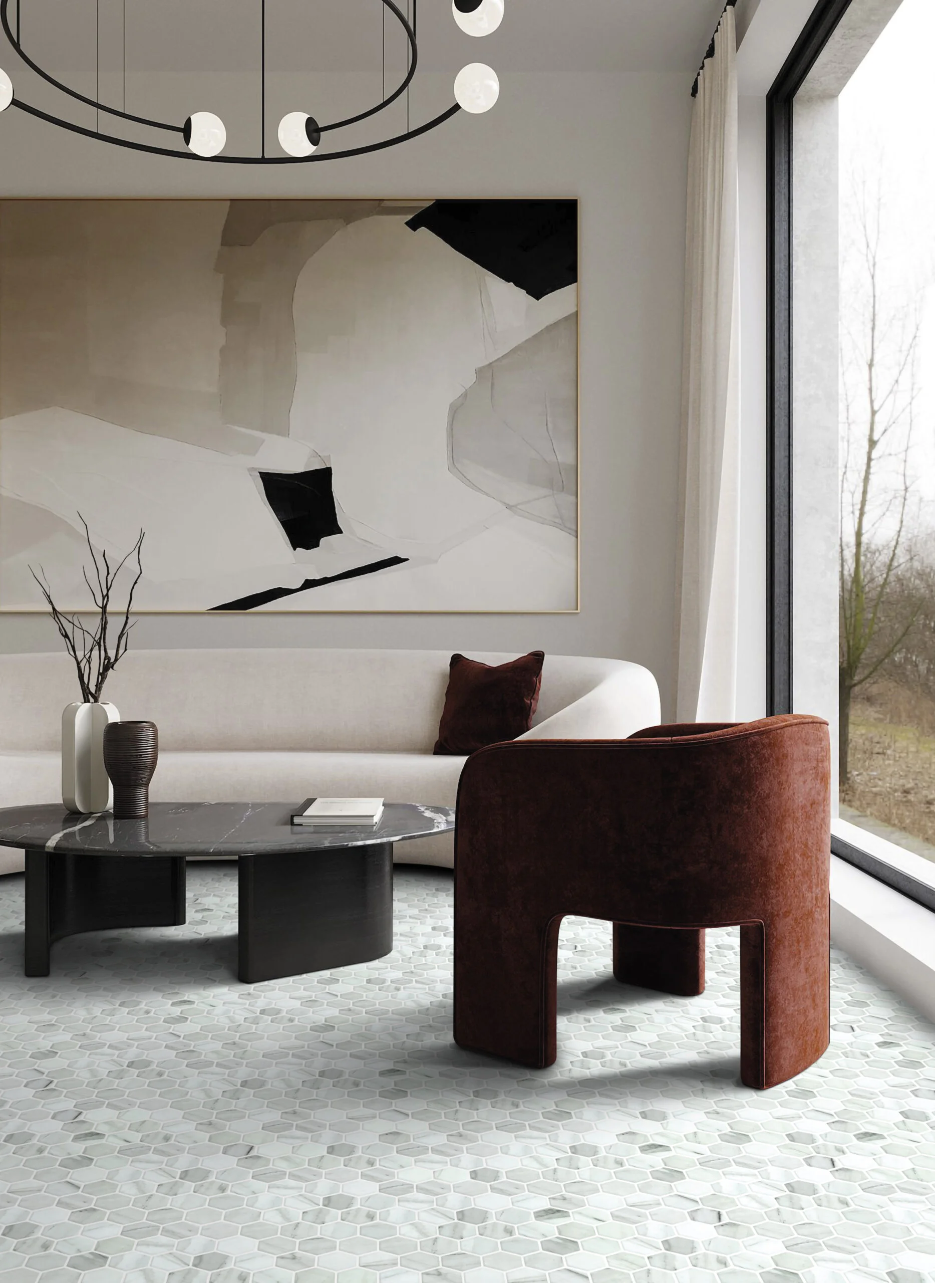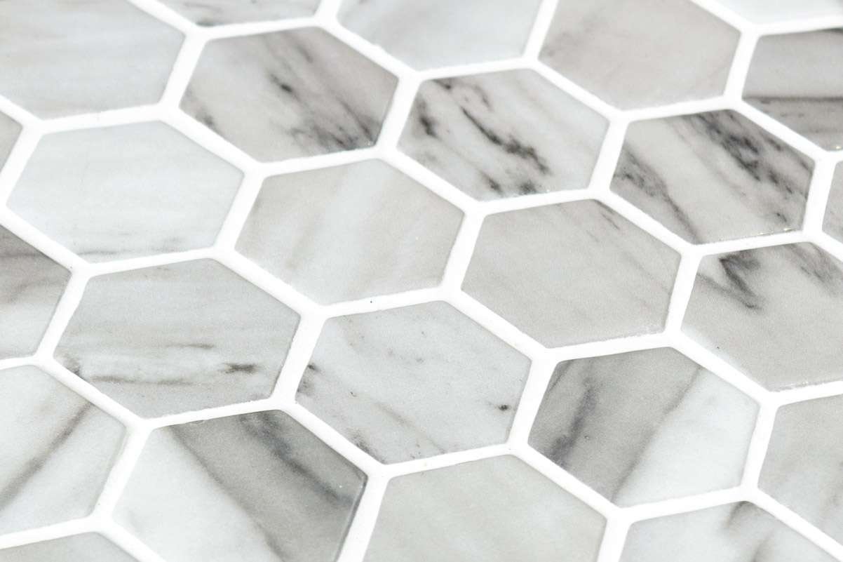 El mosaico vítreo Hex XL Thassos Matte es un mosaico de teselas hexagonales Hex XL (diámetro ø 51,6 mm – 2”) de color gris claro de vetas suaves y acabado mate suave antideslizante. Ideal para decoración de suelos y como revestimiento.