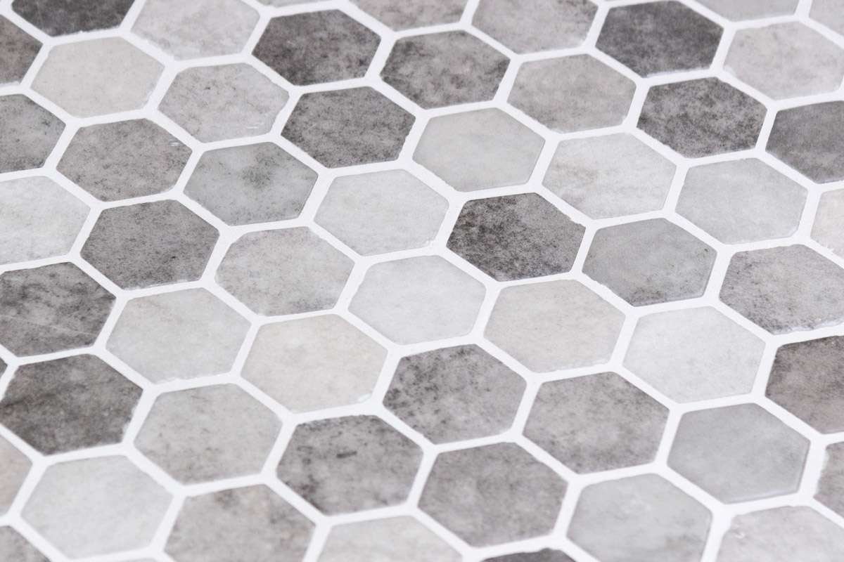 El mosaico vítreo Hex Zement Grey es un mosaico de teselas hexagonales Hex (diámetro ø 31,75 mm – 1, 25”) de aspecto cemento, con una mezcla sutil de grises y acabado mate satinado. Ideal como revestimiento.