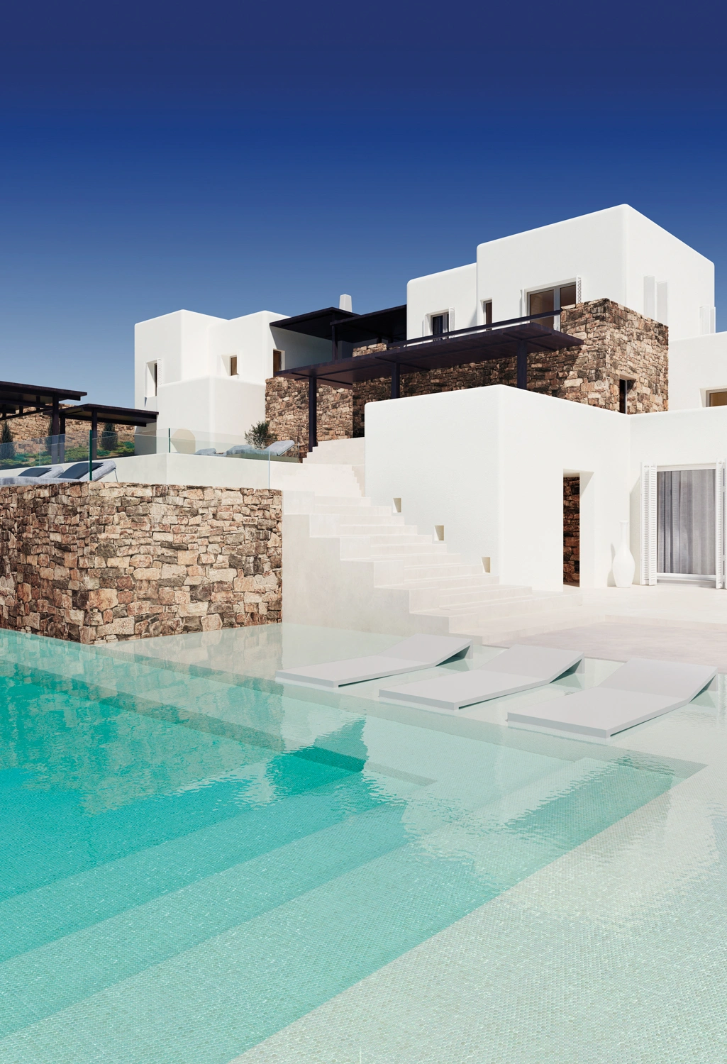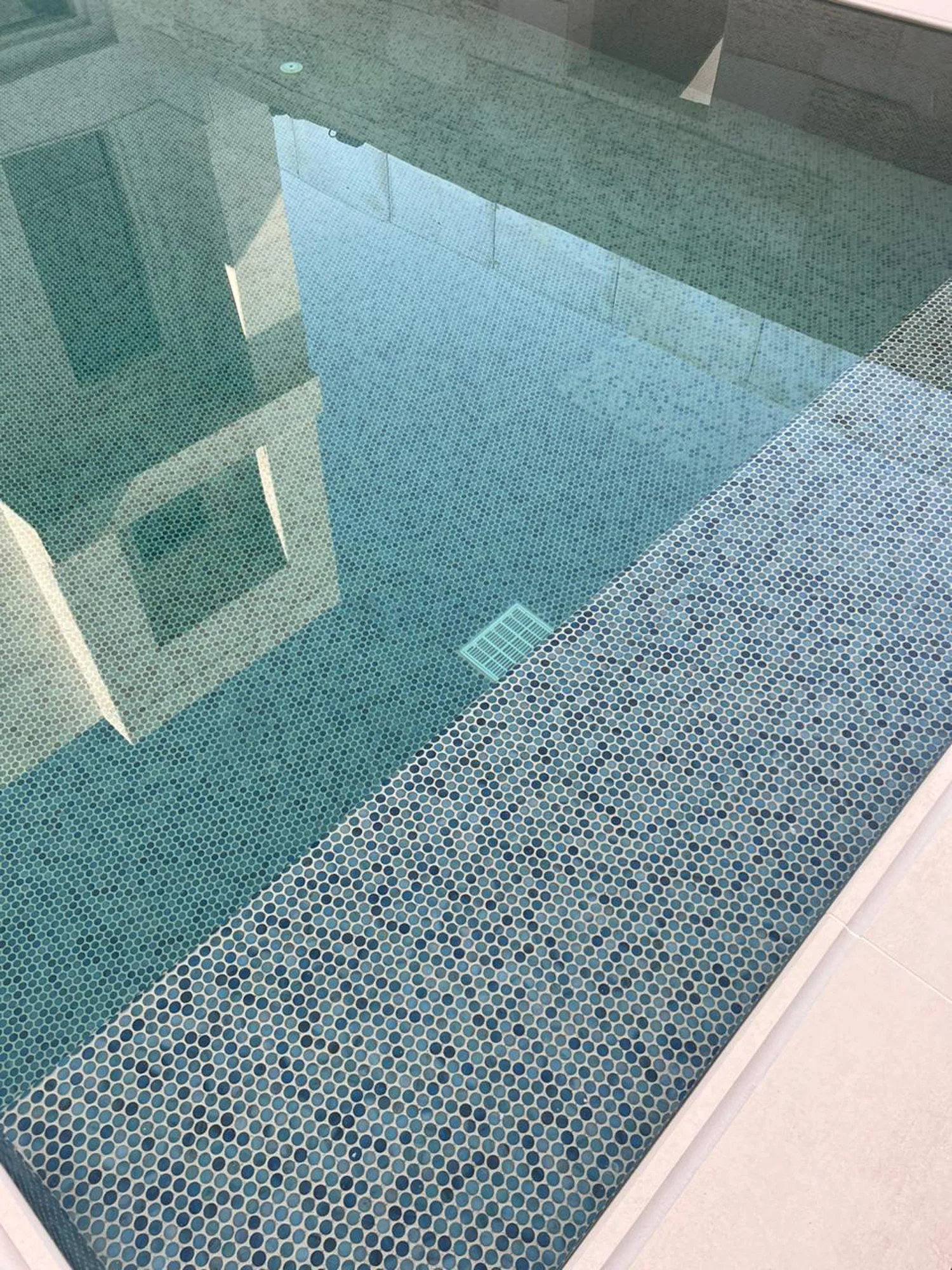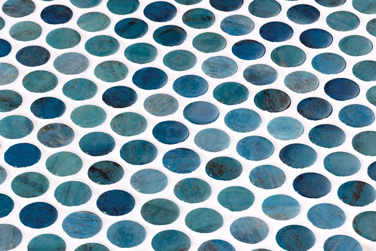 El mosaico vítreo Penny Forest Blue es un mosaico de teselas circulares formato Penny (ø 19 mm – 0, 75”) de color azul y turquesa en acabado brillo. Un producto ideal para conseguir un color turquesa intenso en el agua de la piscina.