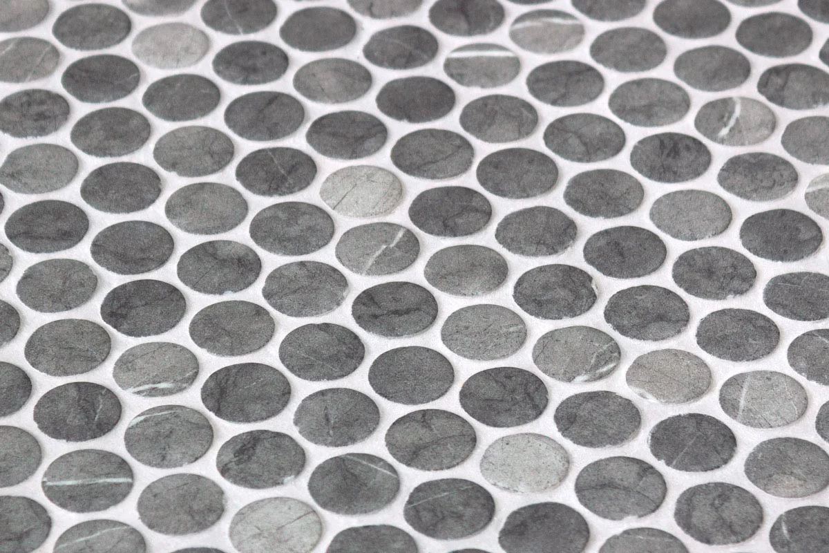 El mosaico Penny Grafito Matte es un mosaico de teselas circulares formato Penny (ø 19 mm – 0, 75”) de aspecto piedra gris oscuro con vetas blanco brillo, en acabado mate SEDA antideslizante. Un producto apto para suelo y revestimiento.