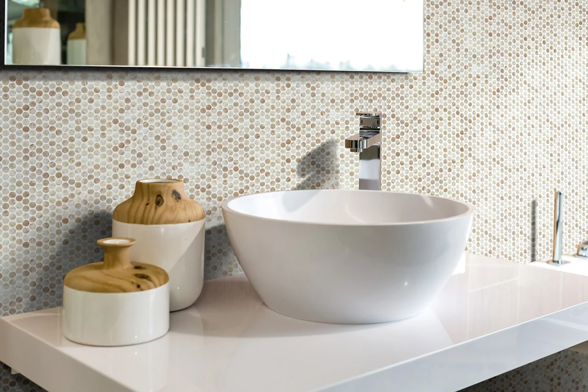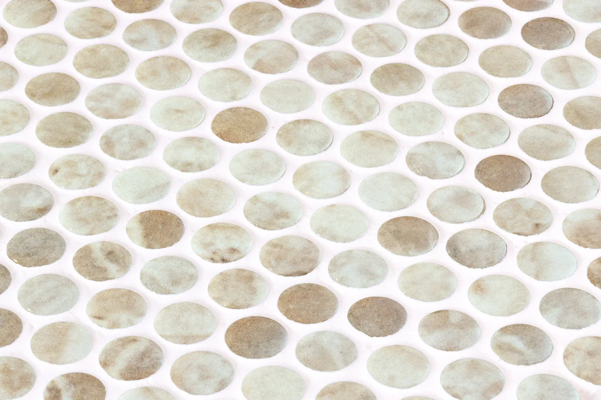 El mosaico vítreo Penny Kara Beige es un mosaico de teselas circulares formato Penny (ø 19 mm – 0, 75”) de color beige y acabado brillo, con aspecto de gema tipo cuarzo. Un diseño con personalidad en tono cálido para piscinas, spa y zonas húmedas.
