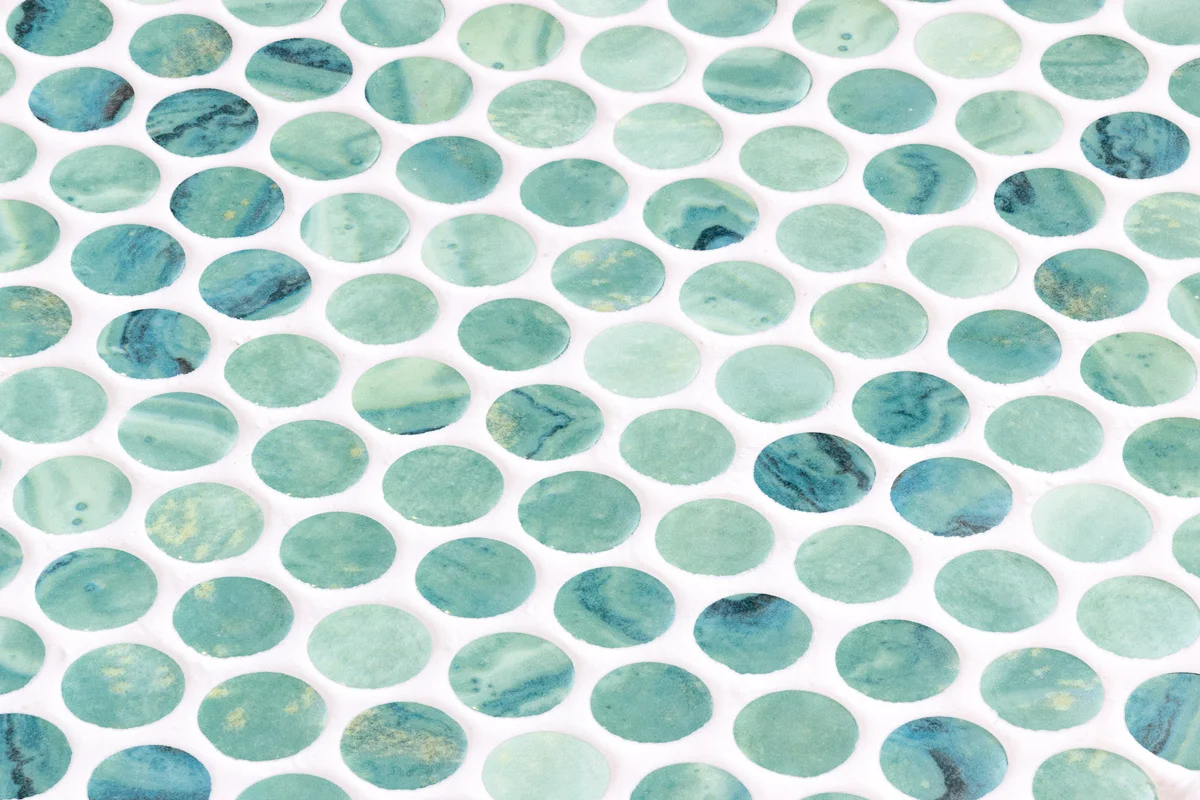 El mosaico vítreo Penny Lungomare es un mosaico de teselas circulares formato Penny (ø 19 mm – 0, 75”) de color verde claro y acabado brillo, con un diseño abstracto de líneas sinuosas. Ideal para piscinas y spas que persigan un diseño con personalidad.