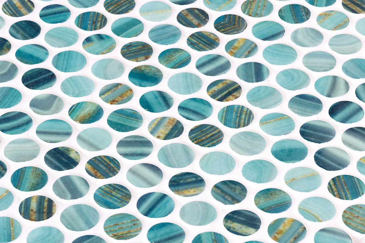 El mosaico vítreo Penny Meru es un mosaico de teselas circulares formato Penny (ø 19 mm – 0, 75”) de aspecto ónice en tonalidades azules y turquesa con detalles dorados en acabado brillo. Mosaico con diseño decorativo ideal para piscinas, spa y zonas húmedas.