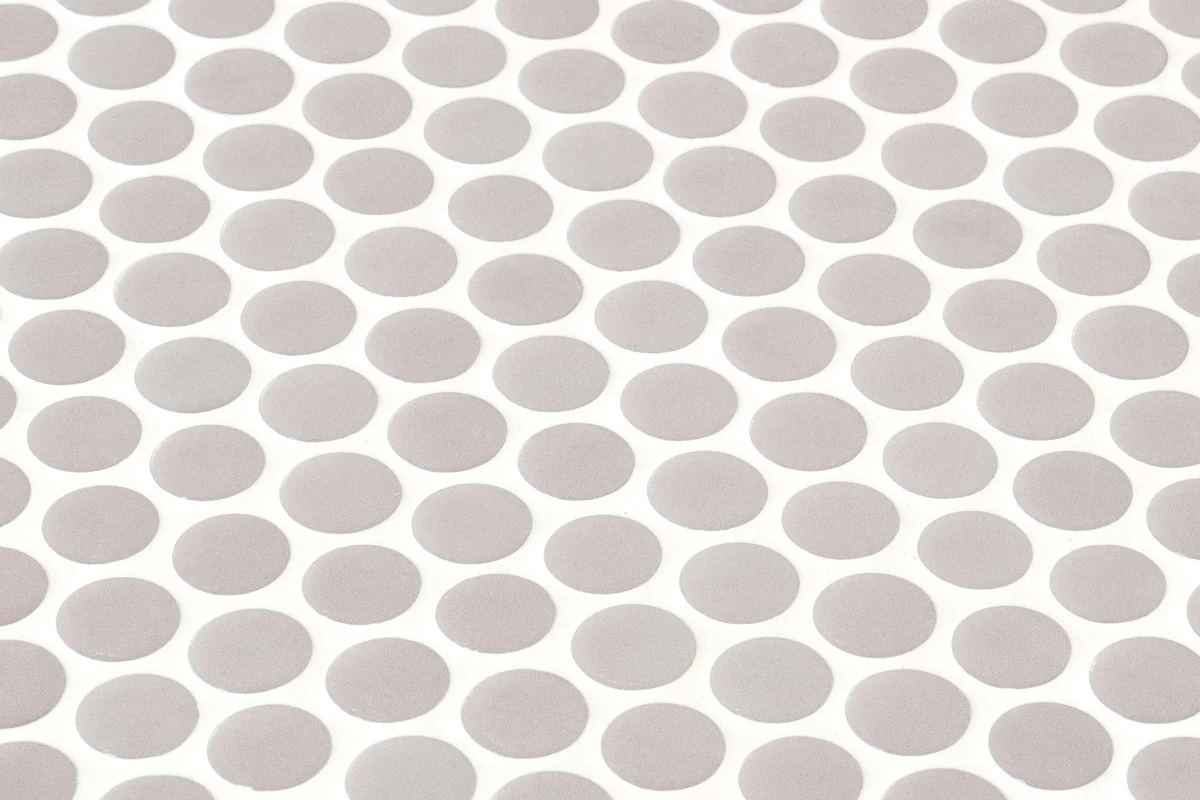 El mosaico Penny Natureglass Taupe Matte es un mosaico de teselas circulares formato Penny (ø 19 mm – 0, 75”) de color gris y acabado liso mate. Apto en suelos residenciales o revestimientos, también en zonas húmedas.