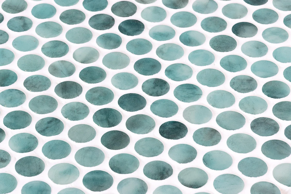 El mosaico vítreo Penny Savu es un mosaico de teselas circulares formato Penny (ø 19 mm – 0, 75”) que evoca un cuarzo de color azul turquesa, en acabado brillo. Mosaico con un diseño inspirado en la naturaleza que resulta ideal como revestimiento de paredes, así como en piscinas, spa y zonas húmedas.