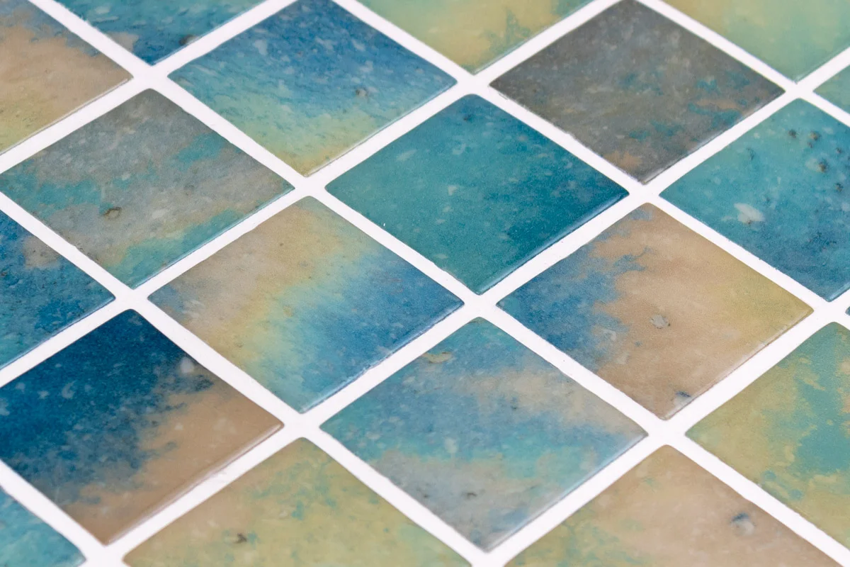 El mosaico vítreo Penta Lake Blend es un mosaico de teselas cuadradas formato Penta (50×50 mm – 2″x2″) de color turquesa y amarillo destonificados, efecto acuarela y acabado brillo. Para piscinas, spa y zonas húmedas que buscan un diseño único.
