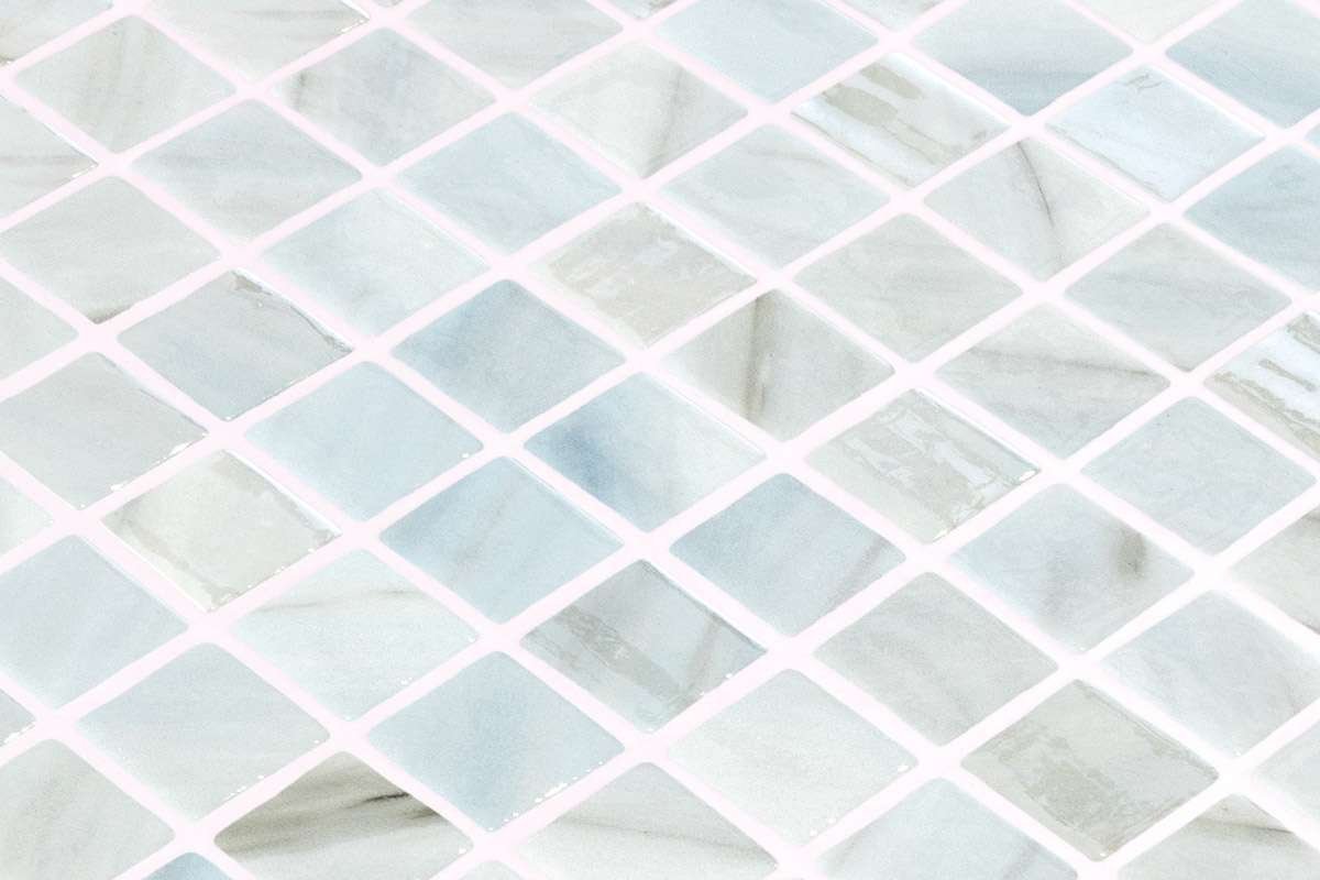 El mosaico vítreo Zhoe Iridis es un mosaico de teselas de formato cuadrado “square” (25×25 mm – 1”x1”) en acabado brillo, de blanco con toques azulados y detalles en ópalo. Un diseño perfecto para revestir cualquier estancia, incluso piscinas.